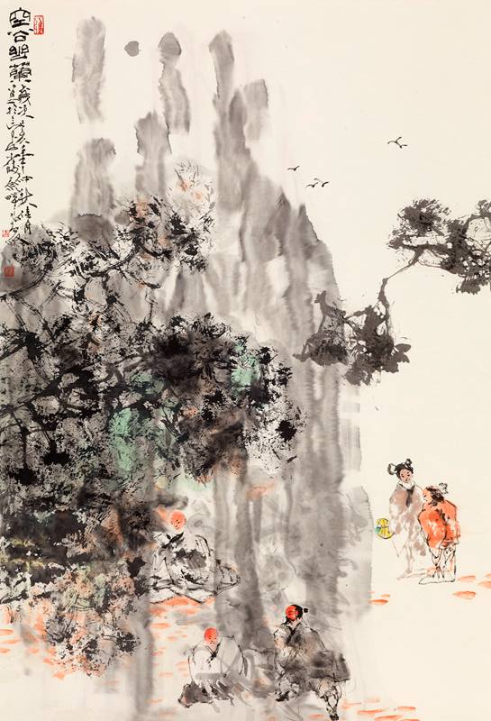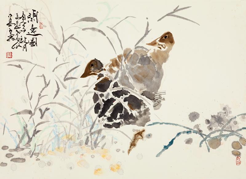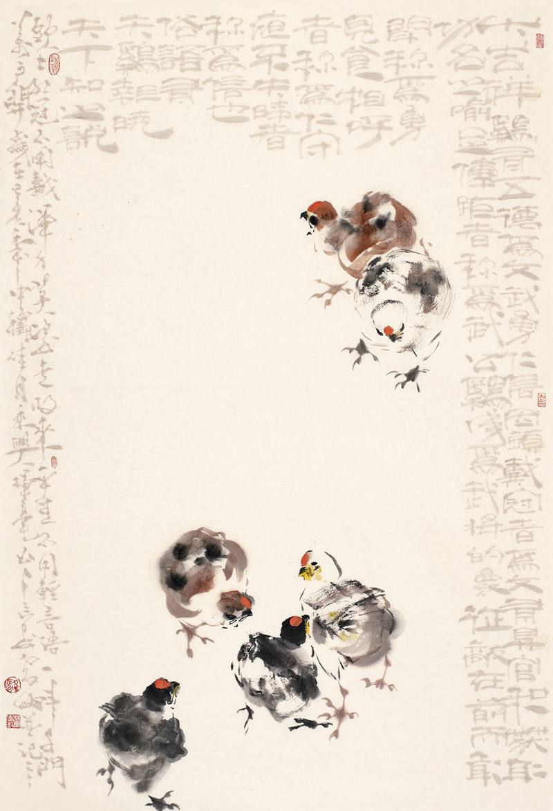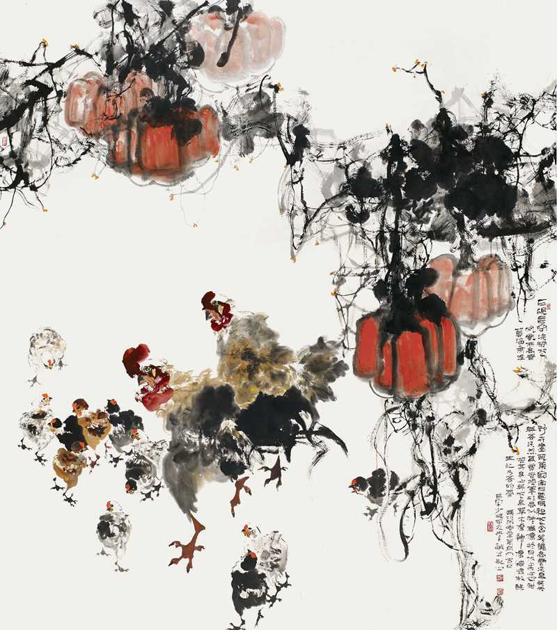 骆孝敏笔下的《群吉图》、《双鹰图》、《秋意》等花鸟画创作,以情调、韵致见长,画面所创造的意境,因物象的丰富而有一种感性生命的充实,笔墨间因洋溢着韵致而意蕴深广,这是一种与文化传统的重会与飘逸灵动的境界。在他的作品中,总是透出一股朴素的芬芳,有如看到一片温润而生机勃勃的世界,在单纯安宁中凝聚着自然生命的律动,其作神闲态静,波澜不惊地表露着大自然和人类心灵的亲近。