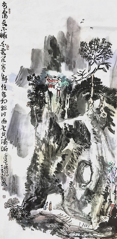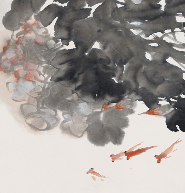 中国水墨画是一项古老的艺术形式,而刘岚的墨色世界,却呈现出一番清新气象,有着强烈的视觉冲击力。他的作品,由色彩到意象乃至气韵,皆一派活泼泼的灵动。从点线勾画到墨色晕染,莫不蕴藏着饱满的精神张力。所有的物,皆是有思想有感情的鲜活。中国画的传统元素表现在刘岚先生的画作里,又全然不同于传统的概念,比如松、鹤、龟、荷等象征吉祥之物,比如梅、兰、竹、菊等代表雅士君子气节之物,比如山、水、亭、榭等等表现天地自然和人文精神之物,作为意象出现在他的画作里,均已经过了他的再创造,被他赋予了心性和思想,成为独属于他个人的东西。站立于这些独具个性之意象的水墨画前,你不自觉地便被一股清新的风冲击着、感染着,被艺术的魅力激活着。