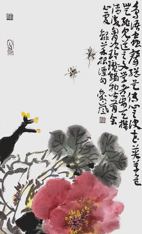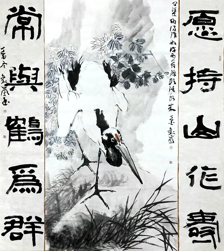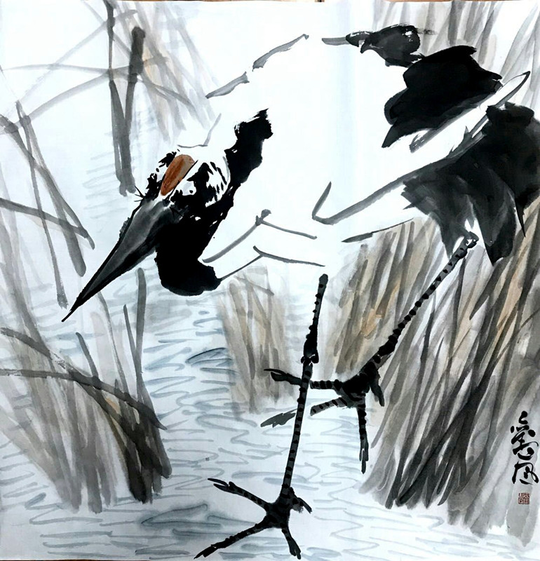 赏刘岚的画,印象最深的,是他画中的鹤意象。鹤在人们的经验中,是优雅的、高贵的,也是宁静的、空灵的,通体仙韵,满身祥和。而在刘岚的作品中,鹤呈现的却不是这静美的外相,而是凌厉和坚韧,是不甘屈服的挣扎,是铮铮铁骨的精神。如他的一幅“梅花知己”,画面中几枝老梅雪中怒放,一只仙鹤迎风傲立。构图简单,却是笔笔达意,留白着墨适宜有度,点、线、色莫不苍劲有力、酣畅饱满。是啊,梅有寒香,鹤有凌志,自然堪为知己,而并肩凌霜傲雪。其它如“且自相惜”中的双鹤,“一路神仙”中立于竹龟间的鹤;“受寿鹤和”和“春山多胜事”之芦苇丛中的鹤;还有富贵牡丹旁的鹤仙眷侣,所呈现的,莫不是鹤于彼时的精神横切面。而要具备这样的洞察力,直接进入物的内在精神世界,窃以为,画家必是下足了画之外的功夫——心功,他不仅让自己的眼看懂物,让手中的笔熟悉物,更试图让物看到他,从而达到物我会心通意,方才动笔着彩、恣意挥毫,从而得以完成这种力透纸背的传神刻画。