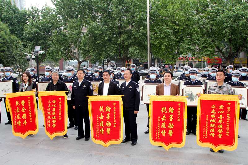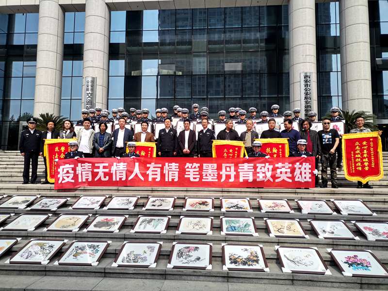 4月29日,为表达对抗疫一线民警的崇高敬意与感谢,陕西省慈善联合会,西安市文学艺术界联合会、西安市美术家协会、陕西广播电视台公共文艺频道、陕西思远文化艺术传播有限公司联合举办以“疫情无情人有情 笔墨丹青致英雄”为主题的慰问活动,走进西安交警支队,捐赠100幅美术作品,讴歌抗疫奉献精神。