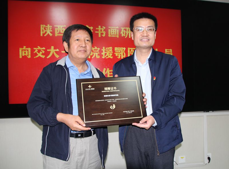 交大一附院党委副书记冯广林向陕西长安书画研究院回赠了捐赠证书