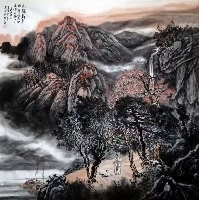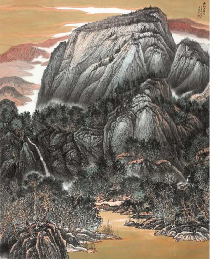 雷虎先生的这幅国画山水作品《幽壑斜阳》,以斗方的形式入画,以虚实相映的笔法,描绘了气韵生动的山水景色。画面采用平远的构图方法,仿佛画家站在高处俯视而入画。画面的近景处是点缀于溪流边的俊美花树,树木造型美妙,青翠苍劲。远处的背景峰峦叠嶂,山谷间云雾缭绕,恰似云海翻腾。一股瀑布从山间飞流直下,一直到山脚汇成溪流,静静的融合在这山水美景中,合二为一,令人心之向往。整体画面虚实相间,充满层次感,给人以苍茫悠远之感。