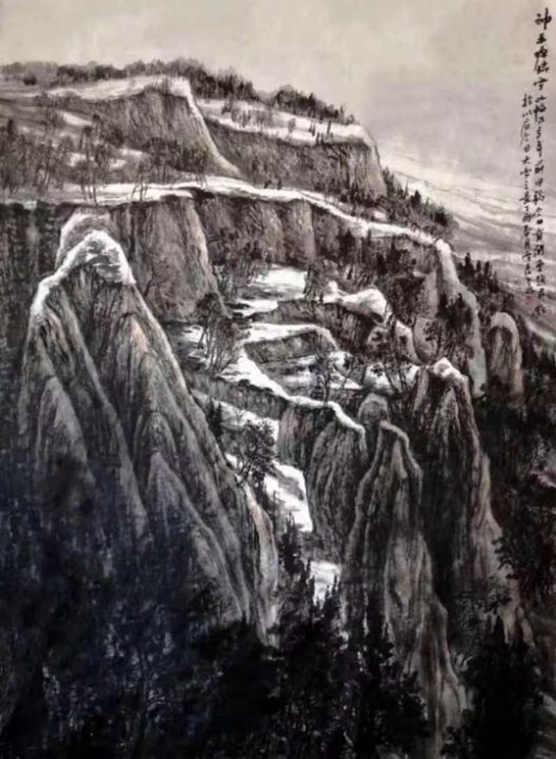 这幅《神禾塬瑞雪》,笔法挺劲,结构严谨,颇具层次感,构图饱满,虚实相间,水墨有机地溶在一起,似有色而无色,画面中群山巍峨,薄雪之下,草木秀美,呈现一派清新安宁的景象,作者内心的宁静自然全然在纸上表现的淋漓尽致,整幅画作看上去颇具气韵之美,让人赏心悦目。