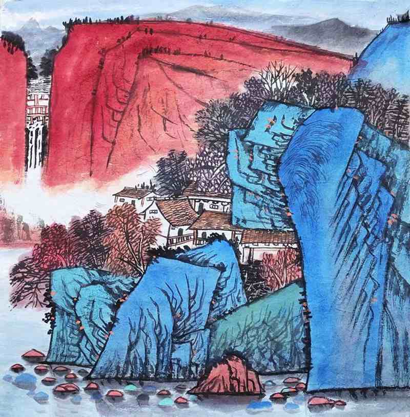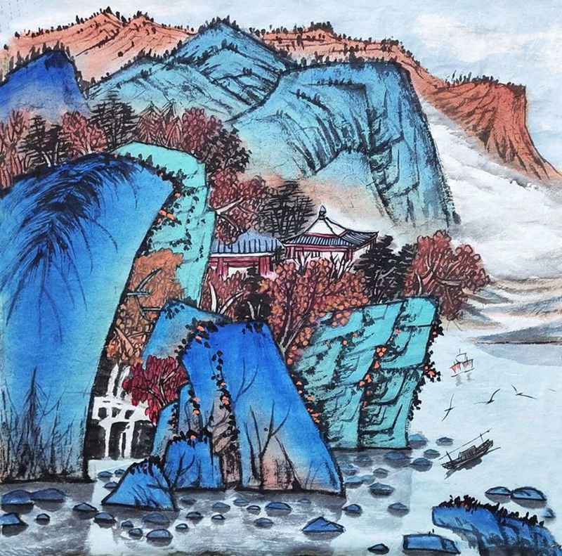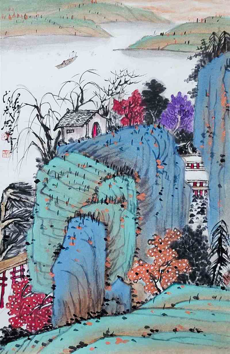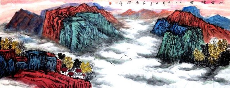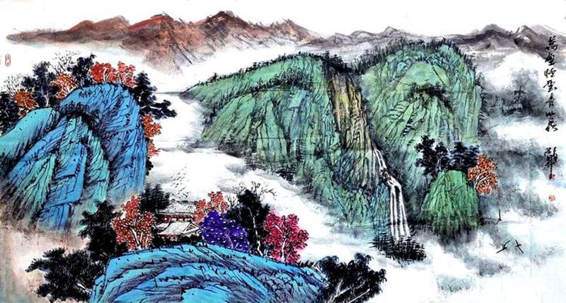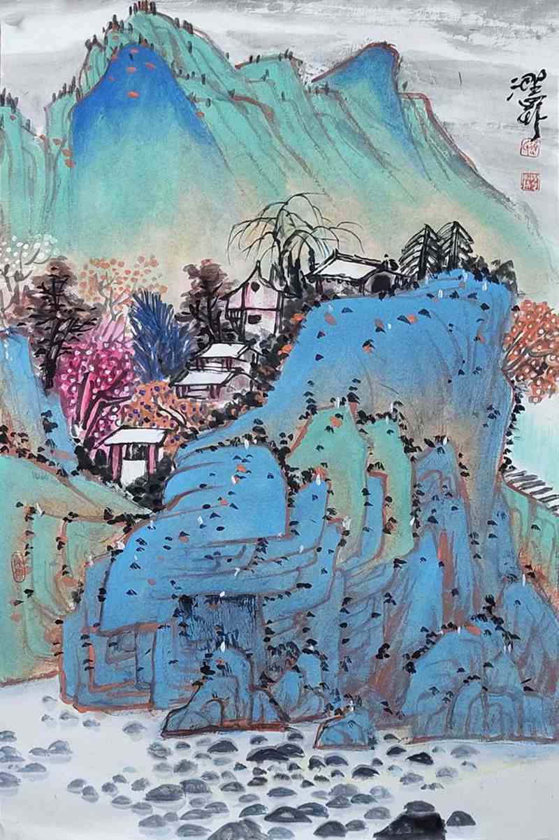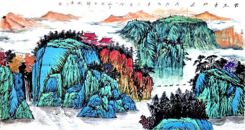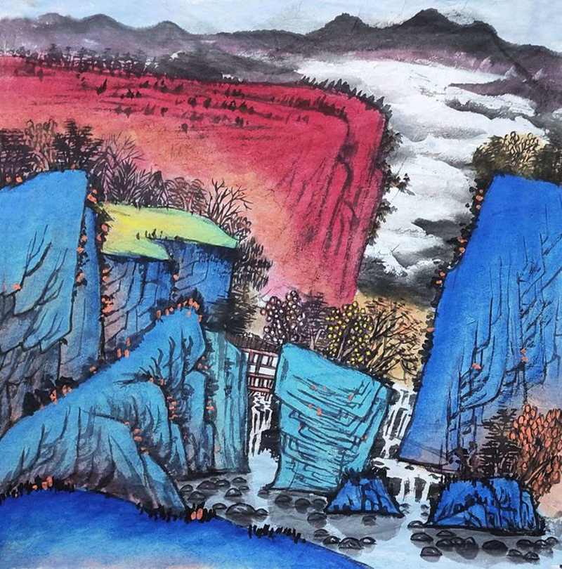 中国画运用重彩始于唐宋,现代美术教育又对日本岩彩绘画(日本画)进行导入,使重彩绘画跨越时代而至今犹存。写意重彩画的近代虽有海派和岭南画派称雄,又有张大千,何海霞等大家的努力,以及现今活跃于中国画坛的诸位艺术家的大力推广,但如果只谈重彩写意山水,那么连润升的山水画可谓独树一帜。