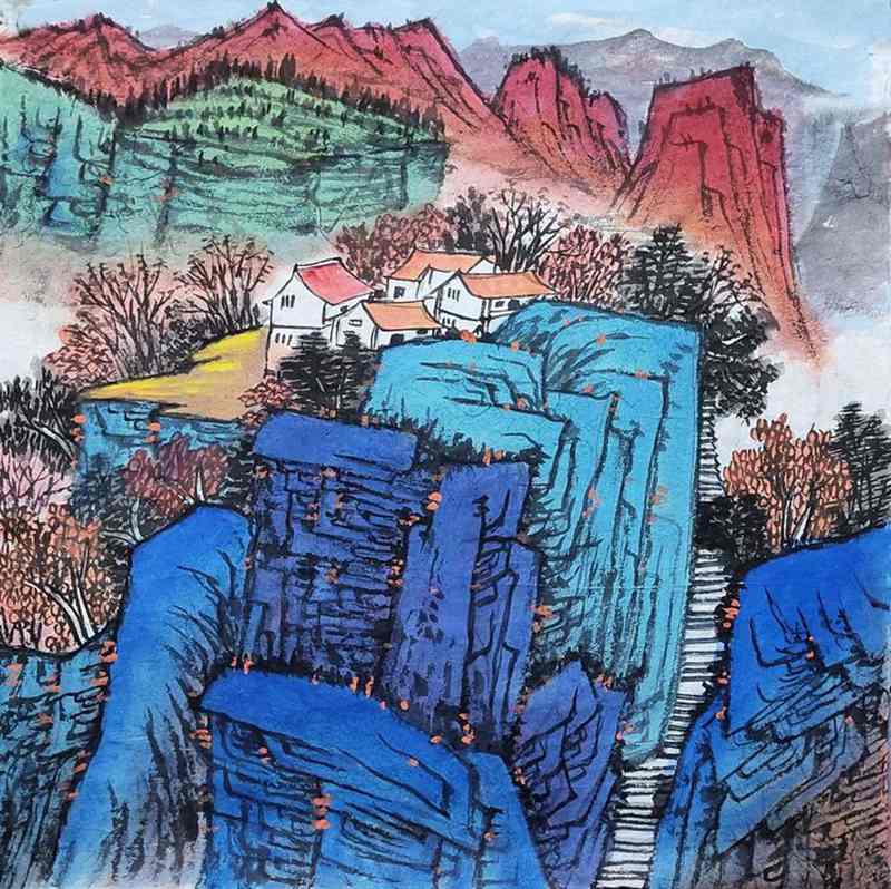 艺术风格是指艺术家在创作成果中所表现出的格调特色,其形成首先在于对传统艺术的学习和积累。通过在长期创作实践中的领悟,得以发新芽,开新花。长期生活在陕西,毕业于西安美术学院国画系的他依然属于长安画派一员。在离开学院之后的日子里,先生上朔唐宋,从唐墓壁画和“二米”入手,得益于对“四王”——娄东派和虞山派的学习。研究成果多展现于作品构图和用笔用墨之上。此乃“一手伸向传统”的写照。那么先生在创作上“一手伸向生活”的结果是什么呢?其实就是画面用色饱和度非常高。补色并置且数层叠加。这也是澄城面花,澄城刺绣等民间艺术的用色特点。连润升就是陕西澄城人氏,民间艺术的精华被他了无痕迹的融入了自己的用色体系,这是他向生活求索的结果。