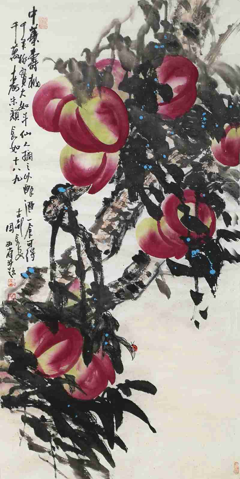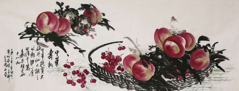 西省先生在对中华寿桃的表现上,自是有着自我独特的心得。他以寿桃枝干的苍老、遒劲,表现着华夏文化的老而弥坚;以笔墨皴染的凝重沉厚和浓淡叶子的率意,体现着中华文明的文脉源远;以寿桃质地的润泽鲜艳,果实的密集,彰显着多灾多难华夏大地人们对文明的美好寄予与渴望;更是以中华寿桃,表现着一种自我胸臆中幸福、健康、长寿的人文精神。