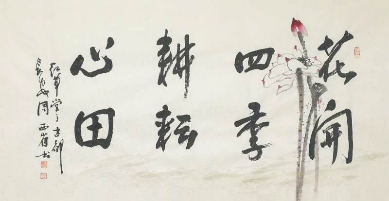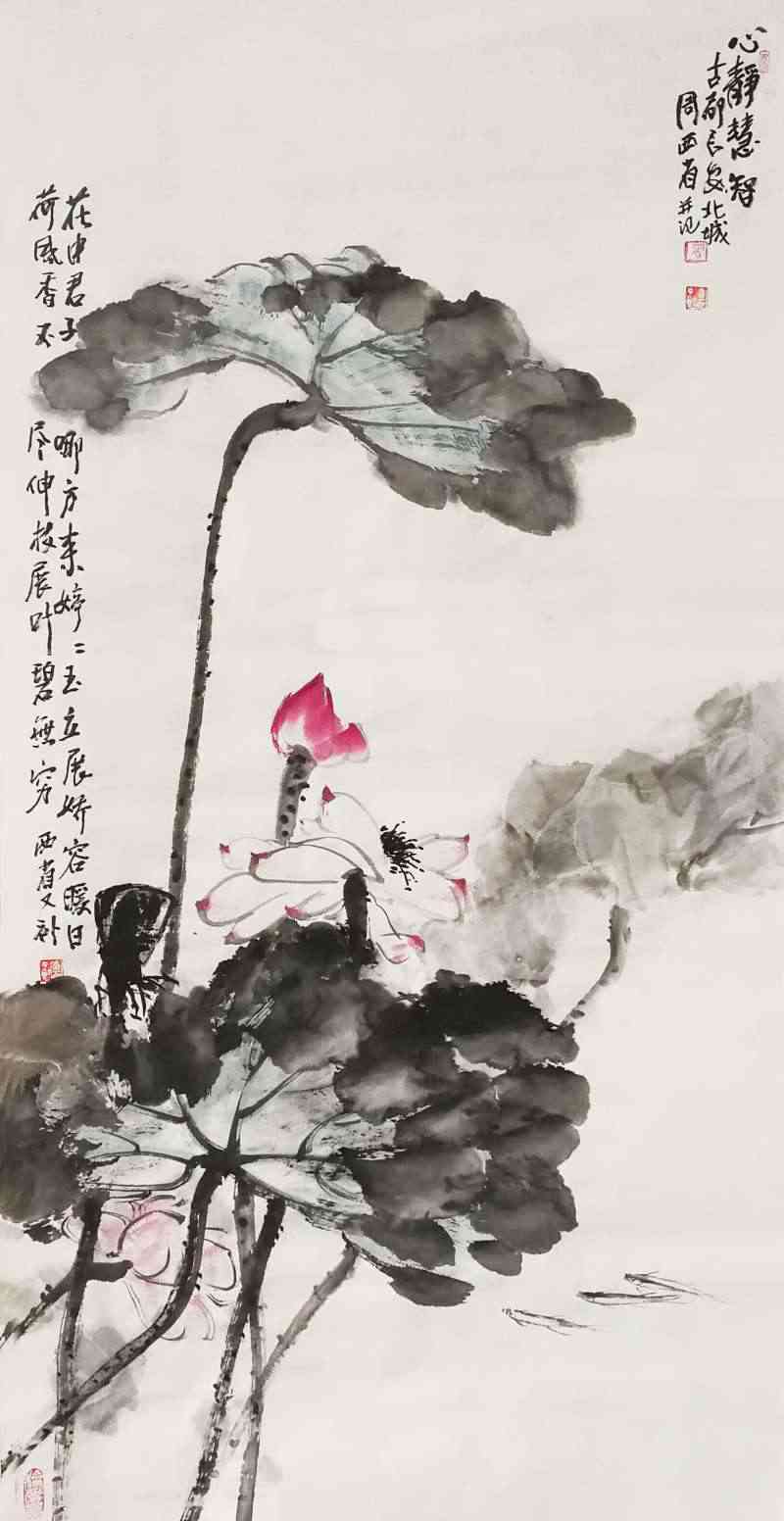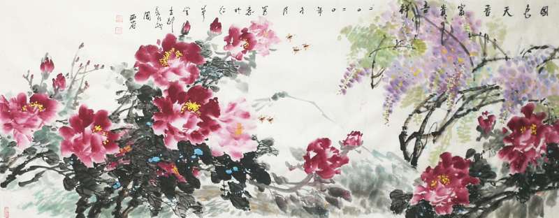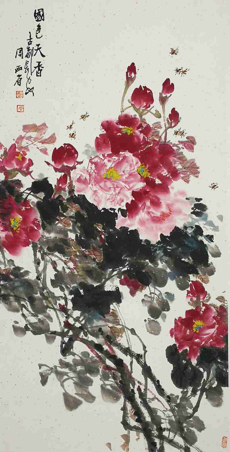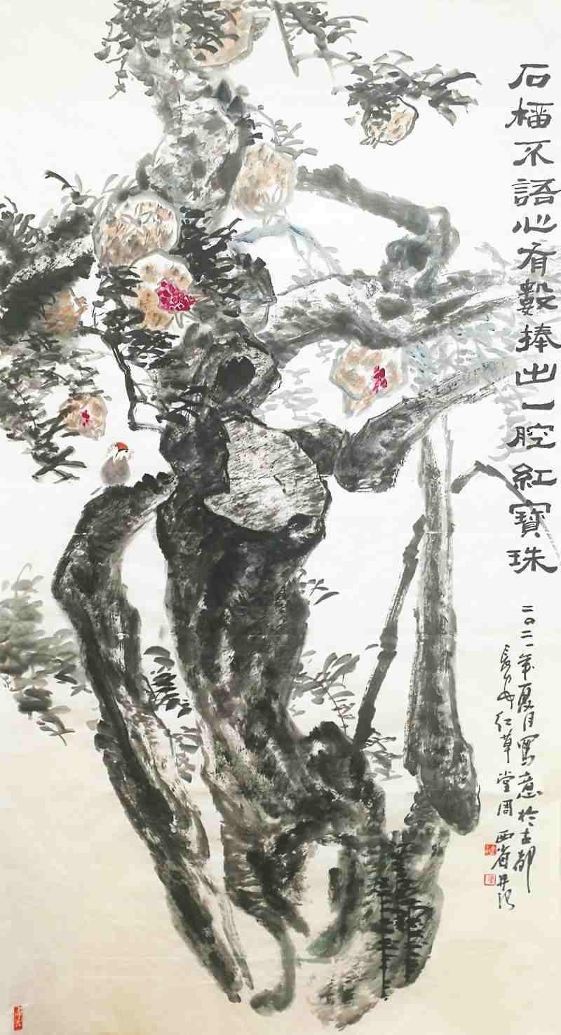 花鸟别苑式的红草堂,有着一股幽雅之气,长居于此,西省先生的心态,也有着一份文人式的娴静。观览画室,墙上几幅四尺竖构图的中华寿桃及多幅花鸟,都以磅礴的气势,厚重的笔墨,营造着一股浓郁的、饱满的、向上的生活气息。而这生活气息,无疑是他多年生活阅历和长期观察写生的积淀。