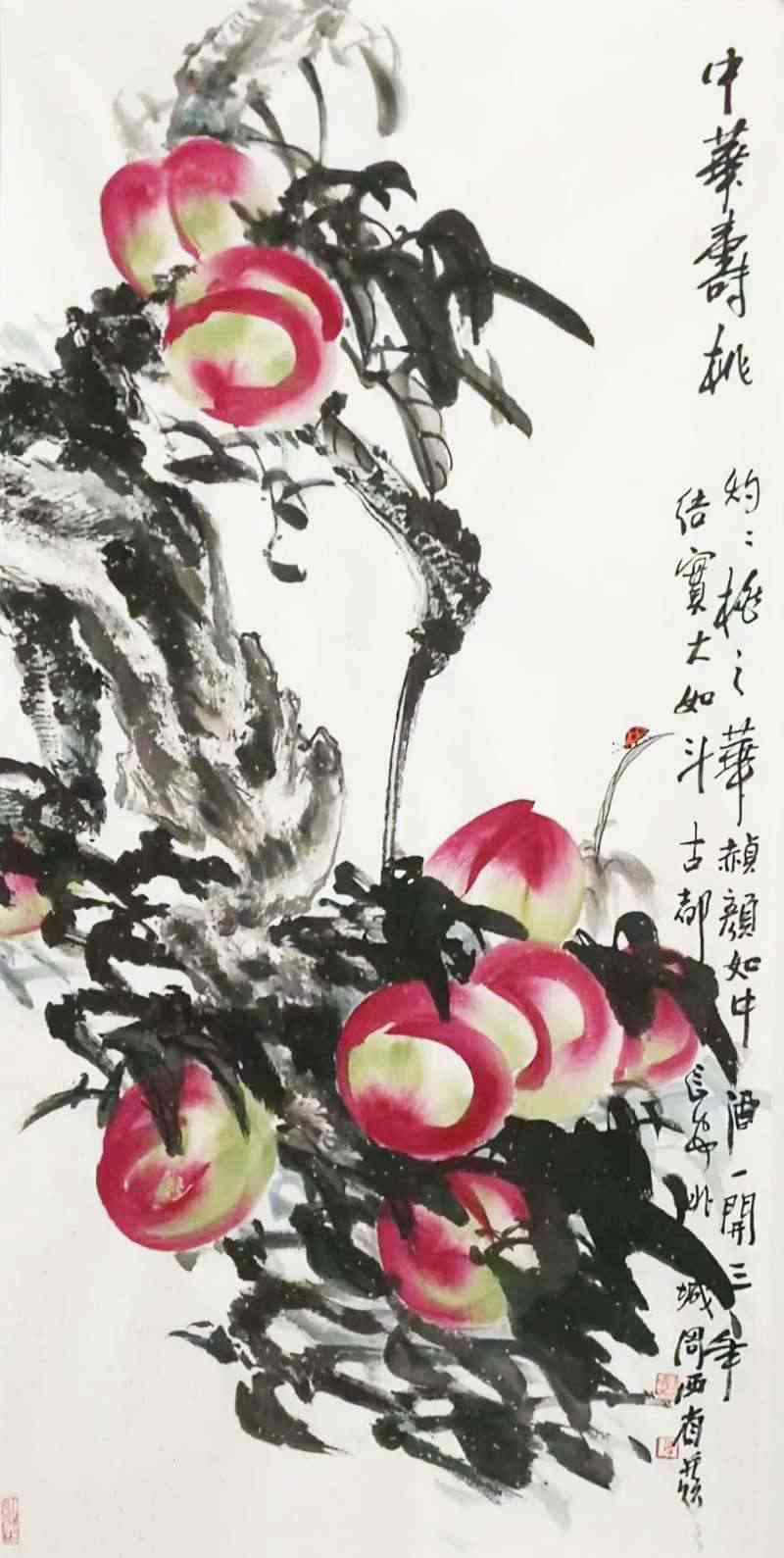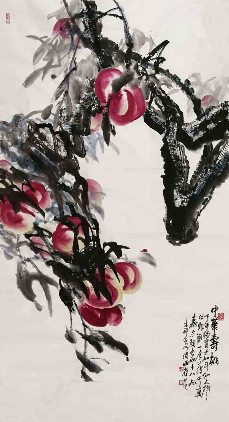 他借对中华寿桃之爱,以中国画的笔墨,谋求着花鸟画的生活情趣。为此,映照在他画面中不同构图,不同形式,不同意态的寿桃,则在画面线条的穿插起承中,彰显着他对中华寿桃的意趣写照。