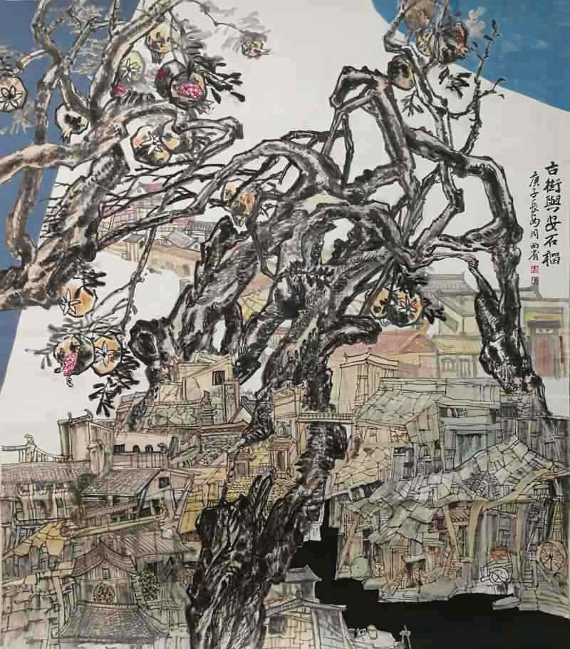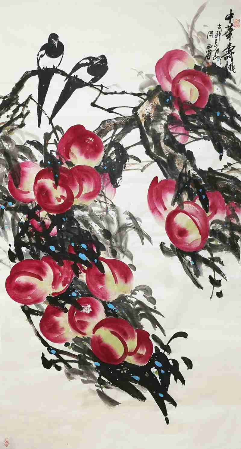 作为一名曾经的专业美术教师,现在的画家,周西省所追求的,渴望确立一种恣肆与雄浑的笔墨境界,因为他的创作母题是“中华寿桃”,因而对“寿桃”的表现,就需要一种磅礴气势和生动的笔墨去彰显。