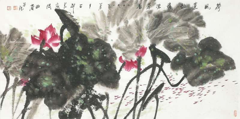周西省的画作,无疑具有浓郁的生活情趣,也有着自我的心境使然。虽然从绘画理论上,周先生是寻求笔墨情趣的,而这也是他花鸟画所谋求的境界。诚然,人的心境是花鸟画的骨,如果说情趣是肉的话。那么,骨肉相连,骨肉相接,则会让画面饱满起来。而他自画面中,以大笔触在宣纸上的渲染,来营造这种饱满与喜庆。