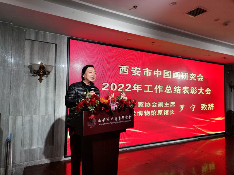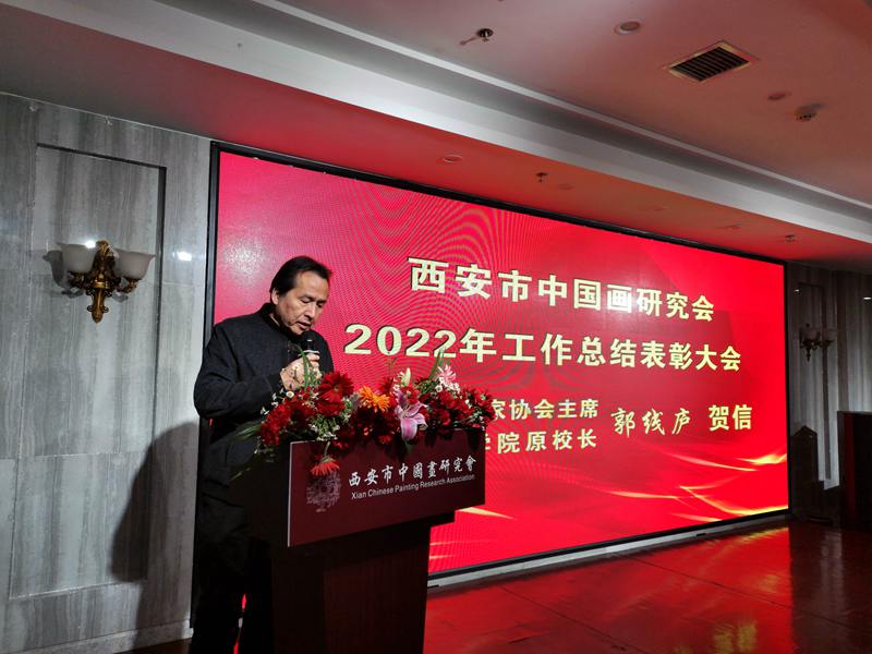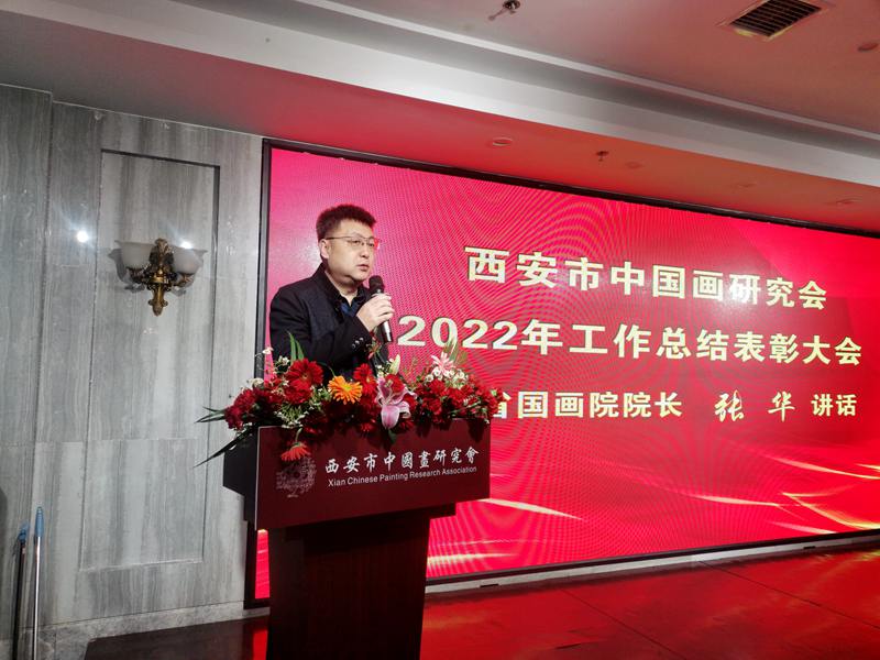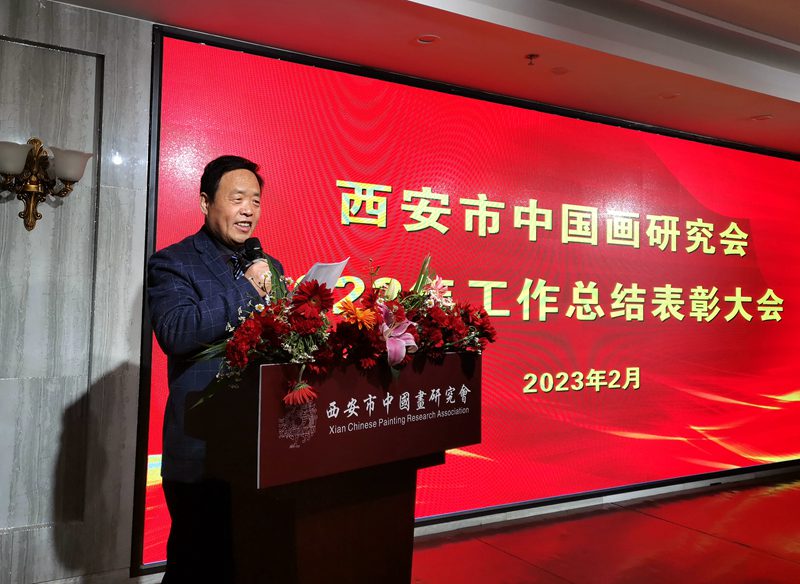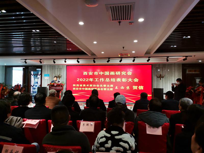 (本网讯)2023年2月26日,西安市中国画研究会2022年工作总结表彰大会在西安紫鑫阁饭庄隆重举办,西安市中国画研究会主席团、秘书处成员,理事、各分会(创研基地)负责人,会员代表,企业界代表,以及新闻媒体记者共60余人出席了大会。