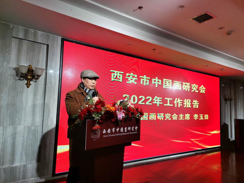 陕西省中国画学会副会长、西安美术学院成教院原院长、教授、著名画家、西安市中国画研究会主席李玉田;西安市中国画研究会副主席骆孝敏,郭新茂,付瑞清,李国华,丁捷,西安市中国画研究会党支部书记,副主席侯顺序出席会议。本次大会的任务是,以党的二十大精神为指针,总结研究会2021年至2022年工作情况,部署研究会2023年工作,表彰奖励2022年度学术贡献奖、先进工作者、突出贡献奖获得者,振奋精神,鼓舞士气,团结带领研究会成员共同为西安市文艺事业再立新功。会上,首先由西安市中国画研究会主席李玉田教授做了工作报告,对研究会取得的工作成绩进行了回顾,并对研究会2023年工作指明了具体方向。他号召研究会全体成员要在新时代,继续围绕"团结奉献尚德精艺"的立会理念,鼓足干劲,砥砺奋进,创新进取,再创辉煌,把研究会工作推向一个新的高潮。大会举行了颁奖仪式,应邀出席大会的知名艺术家,西安市中国画研究会领导为获得年度学术贡献奖、先进工作者、突出贡献奖的个人颁发了荣誉证书。会上学术贡献奖、先进工作者、突出贡献奖获得者代表分别发言,他们表示,要在市文联的指导和研究会的旗帜下,听党话,跟党走,团结一致,认真学习,开拓创新,不断创作艺术精品,为社会和人民做出自己应有的贡。