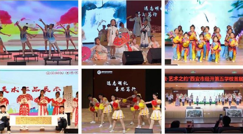 同学们精彩节目表演经开第五学校的学生们以美妙的歌声、动人的舞姿、酣畅的笔墨、精美的手工、创意的作品,给嘉宾带来艺术的盛宴,给艺术节披上华丽的盛装。