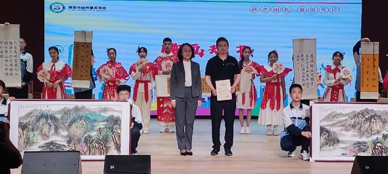 学校美术社团的学生带着他们的作品来到了会场,或浓墨重彩,或横竖撇捺,蕴含着中华传统文化的博大精深与厚重。西安中国画院专业画家窦绪涛来到活动现场,为学校捐赠两幅美术作品,谢校长接受捐赠,并为窦画家颁发捐赠赠书。