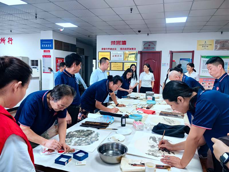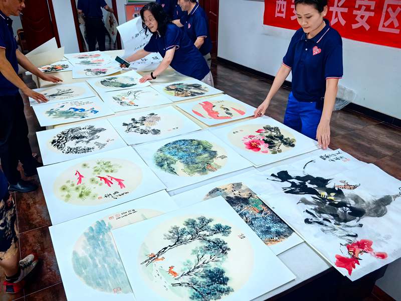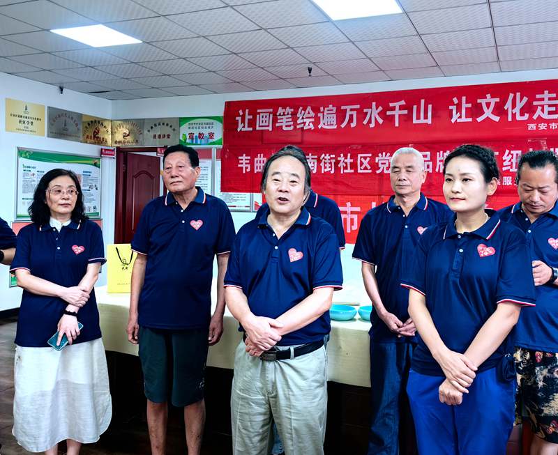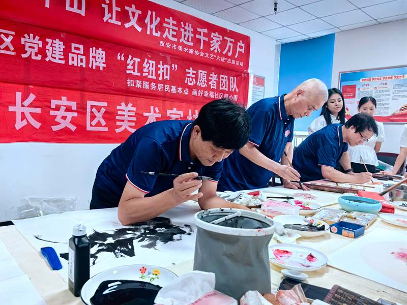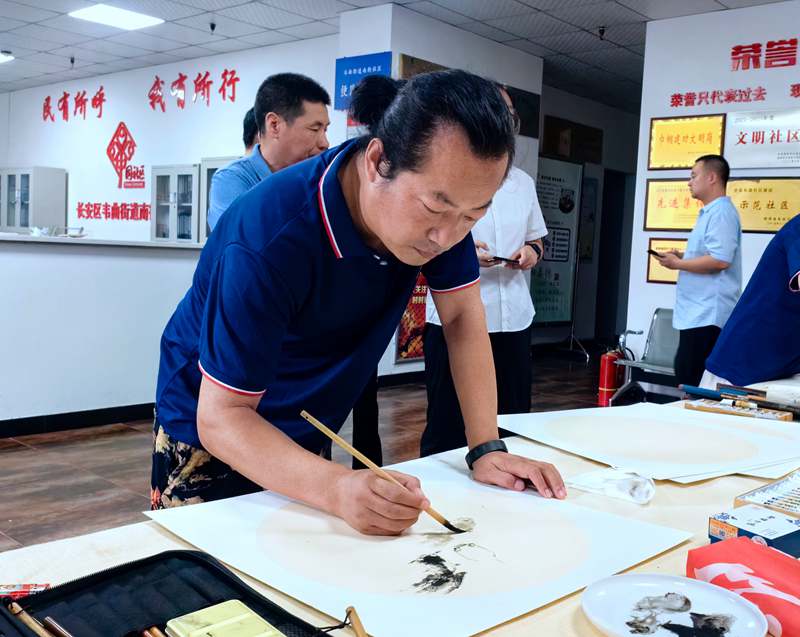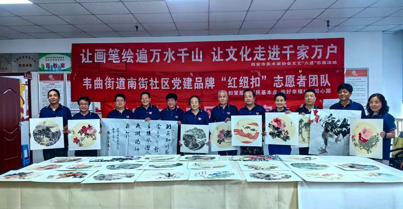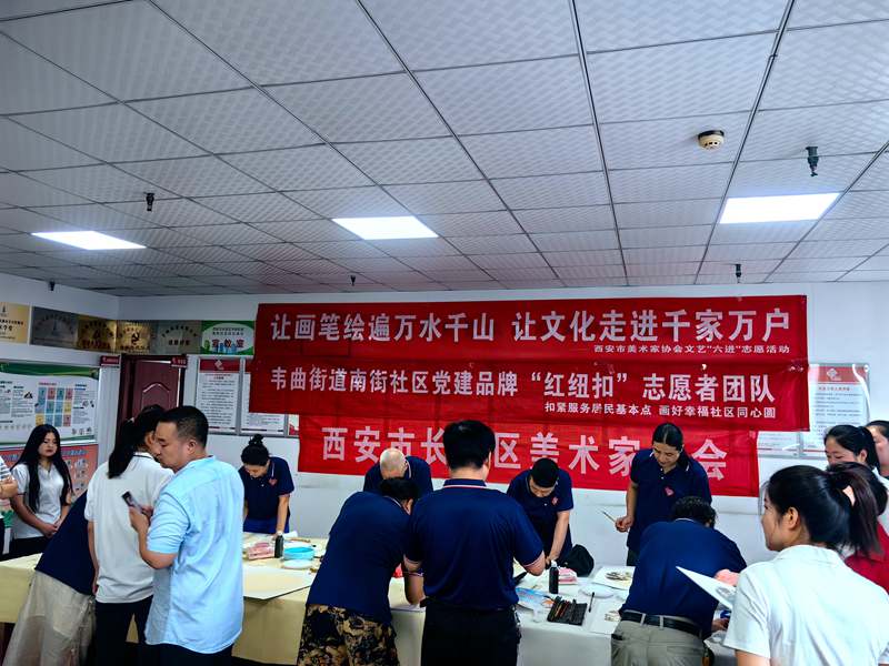 (本网讯)2023年8月16日下午,西安市长安区美术家协会十多位书画家们走进韦曲街道南街社区,开展“让画笔绘遍万水千山·让文化走进千家万户”文艺“六进”志愿活动,义画水墨丹青,以书画艺术形式弘扬中华优秀传统文化,让丰富的文化生活走进千家万户,共绘幸福社区同心圆。