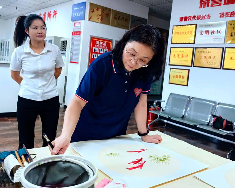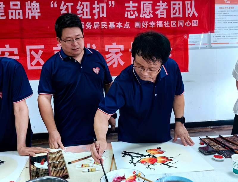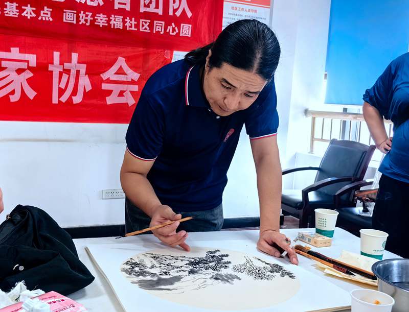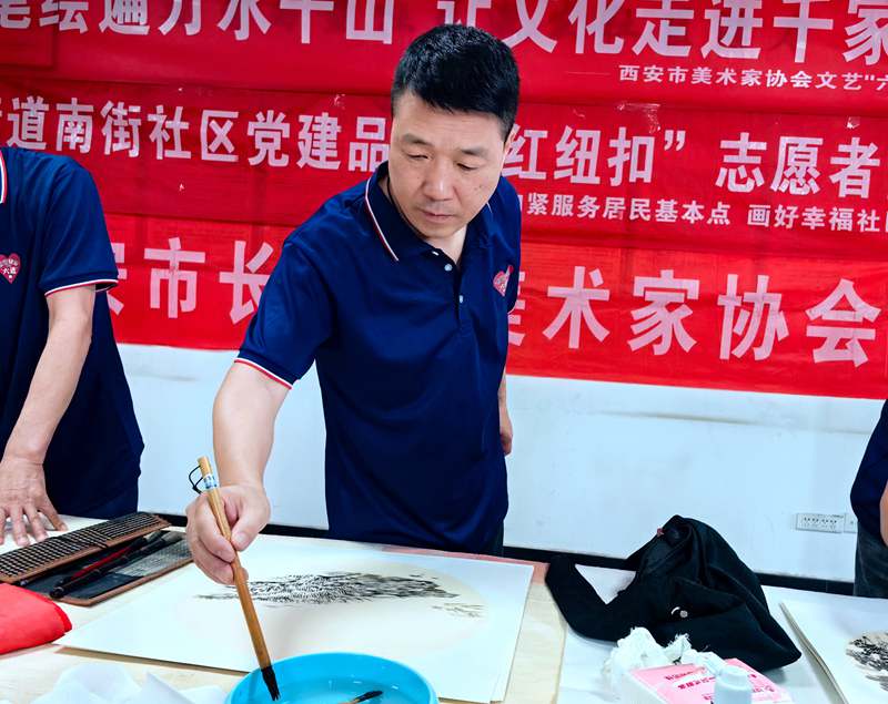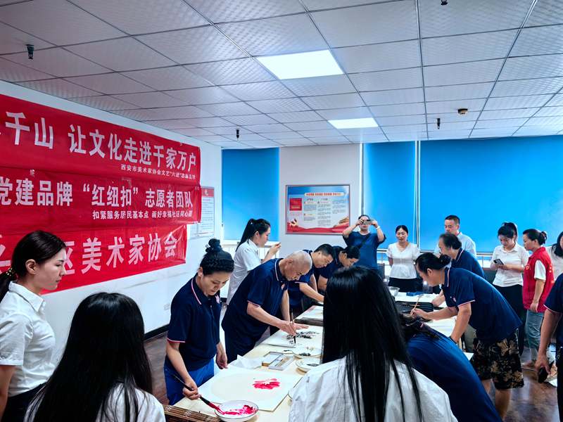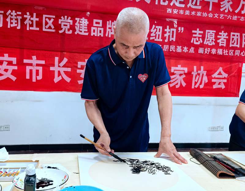 (本网讯)2023年8月16日下午,西安市长安区美术家协会十多位书画家们走进韦曲街道南街社区,开展“让画笔绘遍万水千山·让文化走进千家万户”文艺“六进”志愿活动,义画水墨丹青,以书画艺术形式弘扬中华优秀传统文化,让丰富的文化生活走进千家万户,共绘幸福社区同心圆。