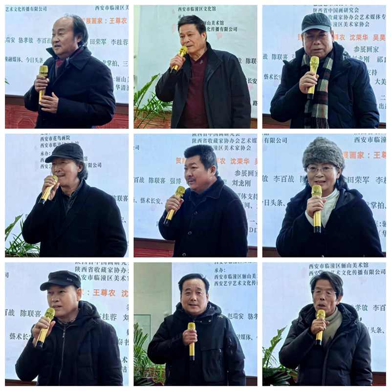 到场嘉宾有:临潼区文化馆馆长钱学斌,临潼区美协顾问姜可夫,临潼区书协副主席庞少波,临潼区美协副主席魏振选,临潼区美协副主席东栋良,临潼区书协副主席范小东,陕西书画研究会副秘书长白米娜,渭南嘉合美术馆长曹少云,陕西美术评论家蔡永升,陕西省收藏家协办会艺术媒体专业委员会副主任张小伟、赵刚、赵文宇、拓展部副主任弋敏婷及书画爱好者300多人参与本次开幕。