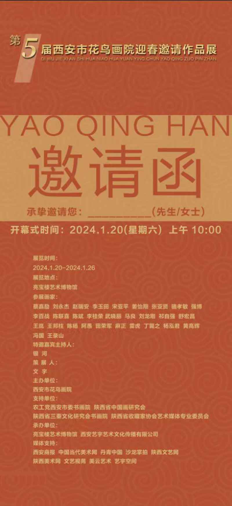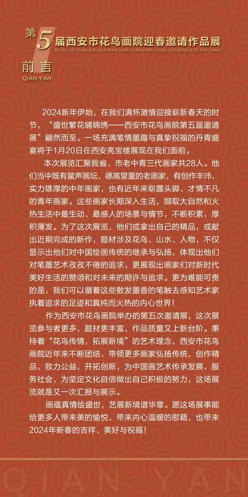 2024新年伊始,在我们满怀激情迎接崭新春天的时节,“盛世繁花铺锦绣——西安市花鸟画院第五届邀请展”翩然而至。一场充满笔情墨趣与真挚祝福的丹青盛宴于将于1月20日在西安亮宝楼展现在我们面前。