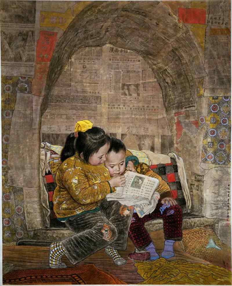 除此之外值得提出的是,王有政对人物画中背景的处理,总是不厌其细,不厌其精,这种背景的映衬,并没有削弱画面的主次,而是产生更多的画外语言,耐人寻味,起到极大的渲染和升华主题的效果。比如作品《读》中,姐弟俩坐在窑洞窗台上一起读书,身后的窗户被旧报纸糊得严严实实,报纸上密密麻麻的文字,都刻画得清晰可见,令人一下回到了那个物质匮乏的年代,很接地气。《奶奶孙孙》中,奶奶和孙子蹲在田间那亲昵的一瞬间,被身边大片黄色的花丛包围,那一簇簇繁盛的花瓣,春天般的润泽、生命的绚丽,与奶奶的沧桑拙朴,形成了鲜明的对比,让人读之如甘饴清露,苍润咸收。