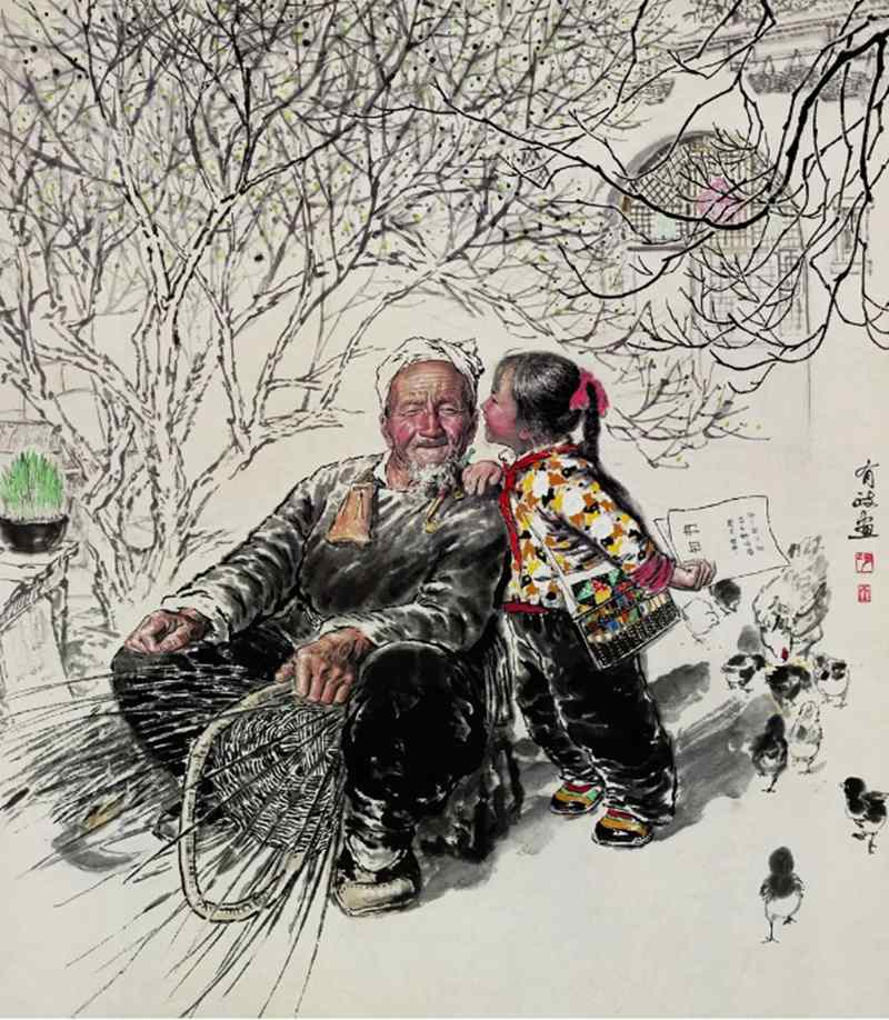 在这点上,王有政的成名作、小写意作品《悄悄话》,表现得很突出。窑洞前迎来了春天,小姑娘放学回来,拿着通知书,趴在爷爷耳边悄悄地说着喜讯,爷爷面带笑容,沉浸在天伦之乐中。这幅作品创作在党的十一届三中全会后,中国进入了一个政通人和、万象更新的新局面,这是一幅温馨和谐的时代画面,作品中能感受到普通温馨的生活气息,和真挚的社会民生状态。作品的笔墨、造型和用色都臻于完美。