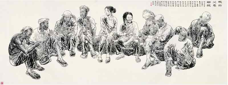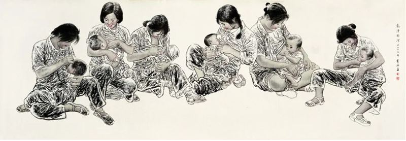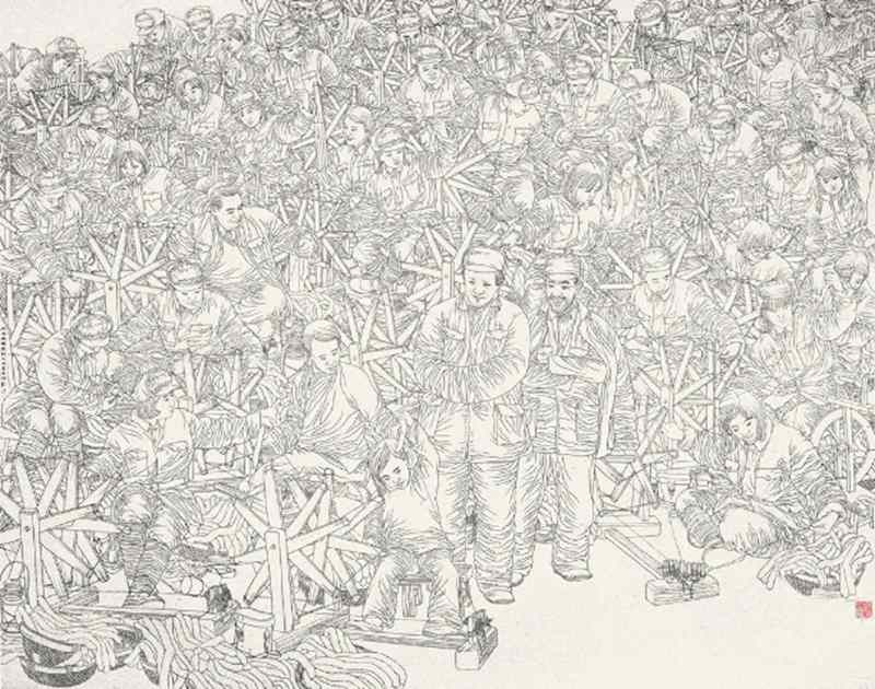 他2009年为国家重大历史题材创作工程创作的《纺线线——延安大生产运动》(与杨光利合作),更是用中国画白描的手段,单纯以线条,用情用心塑造的人物画的典范,突显了中国人物画以线造型达意的独特魅力。