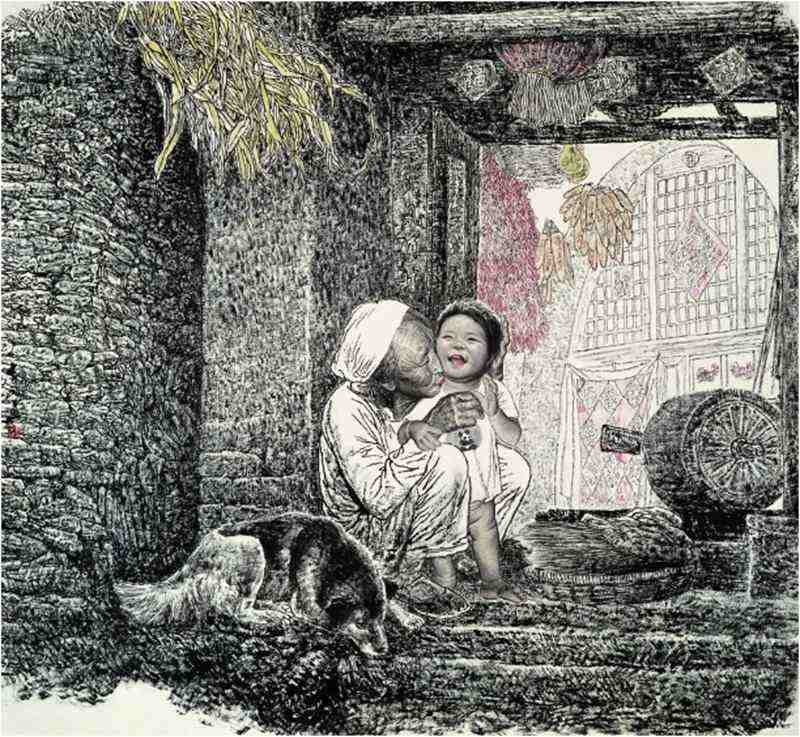 这样的作品还有《读》《倦旅图》《捏扁食》《奶奶孙孙》《捏花馍》《一生耕耘》《我的父老乡亲》《耕读传家》《流水清清》等,每一画都能令人感动如初,产生对人民的爱,对生活的赞美之共情感。
