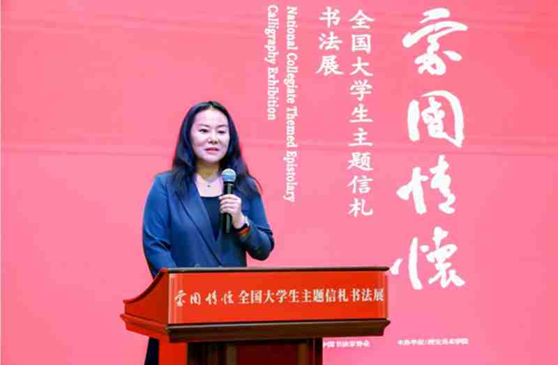 张潇羽在致辞中讲到,“家国情怀”是中华民族最深厚的历史情感和精神纽带。展览精准把握了时代脉搏与青年心声。她勉励青年学子深入研习经典,领悟书法文化内涵与美学精神,坚持守正创新,探索符合时代审美、展现青春风采的艺术表达,让古老书法在新时代绽放璀璨光芒。