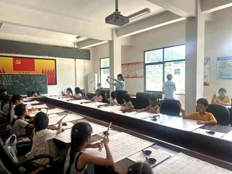 书法启智,文化润心——8月1日抵达当日,实践队与明星村党支部书记及村干部举行座谈会,了解当地情况,为后续针对性开展教学活动打下基础。随后实践队以“书法艺术+文化传承”为主线,课程首日通过书法理论课向孩子们讲解汉字的发展历程和书法艺术的精髓,增强文化认同感。随后几天,队员们手把手教授硬笔和毛笔的握笔姿势、基本笔画等技巧,将马克思主义美育观融入教学,引导孩子们在书写中感悟中华文化的深厚底蕴。